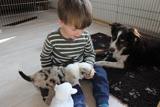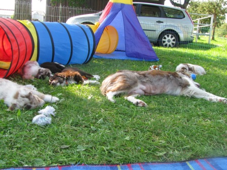Unsere Welpen wachsen bei uns im Haus auf mit direkten Familienanschluss. Die Wurfkiste steht in den ersten 2,5 - 3 Wochen im Schlafzimmer, dass die Mutti mit ihren Welpis einfach ihre Ruhe hat, anschließend ziehen sie in unser Wohnzimmer ( bzw Küche, Esszimmer, Wohnzimmer sind in einem 12m langen Raum ) um. So lernen die kleinen von Anfang an alle Geräusche des Alltags kennen. Ab der vierten Woche dürfen sie bei geeigneten Wetter nach draussen auf unseren Welpenspielplatz. Natürlich werden sie viel gestreichelt und geknuddelt. Bei uns lernen sie andere Tiere und Besucher kennen. Seit 2013 bin ich Mutter und so wachsen die Welpen mit unserem Sohn auf. Ebenso werden sie an das Autofahren und Halsband tragen gewöhnt. Selbstverständlich beschäftigen wir uns mit jeden kleinen Schatz einzeln. Die kleinen werden nach der achten Woche in ihr neues Heim abgegeben.