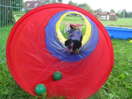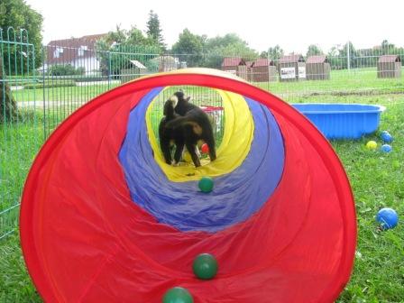 auf unserem Spielplatz:Arwen im Tunnel Brianna, Fionn und Arwen