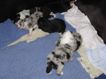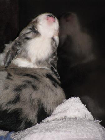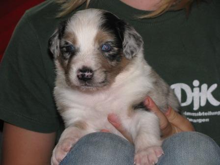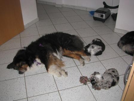 Keely hat von Freitag auf Samstag (13.06.09 ) innerhalb von 3.5 Stunden, 6 Wonneproppen geboren. Es sind 3 Mädchen und 3 Jungs. Die Mädchen sind alle Blue Merle's und bei den Jungs 1 Blue Merle und 2 Black. Bin sehr glücklich, Keely hat das super gemacht, keine Totgeburt und auch kein schwaches Baby. Nach mehreren Besuchen bei Rüden und Besitzern, hab ich mich für Wolf von Fau Deckert entschieden. Frau Deckert ist eine langjährige Züchterin und sie hat mir Wolf angeraten. Seine Untersuchungsergebnisse sind bestens. Bei Interesse unserer kleinen Schätze rufen sie uns einfach an. Gerne können sie uns besuchen kommen und sehen wie die kleinen aufwachsen- nach kurzer Terminabsprache. Besuch der Kleinen ist ab den 10.07.09 möglich, wenn sie mal 3-4 Wochen alt sind. Hier noch ein paar Fotos