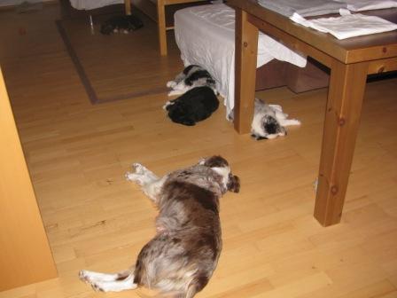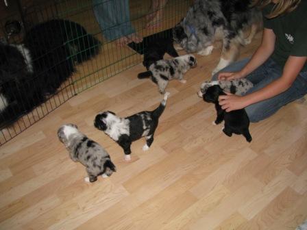 nach dem Spiel folgt ein Schäferstündchen, Scottie und ein Teil der Welpen mit Ginger im Flur, Keely mit dem Rest der